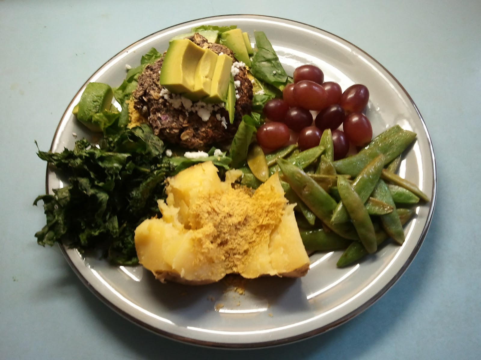 | Grapes, 1/2 Potato, Kale/BB Burger/Avocado, Snap Peas |